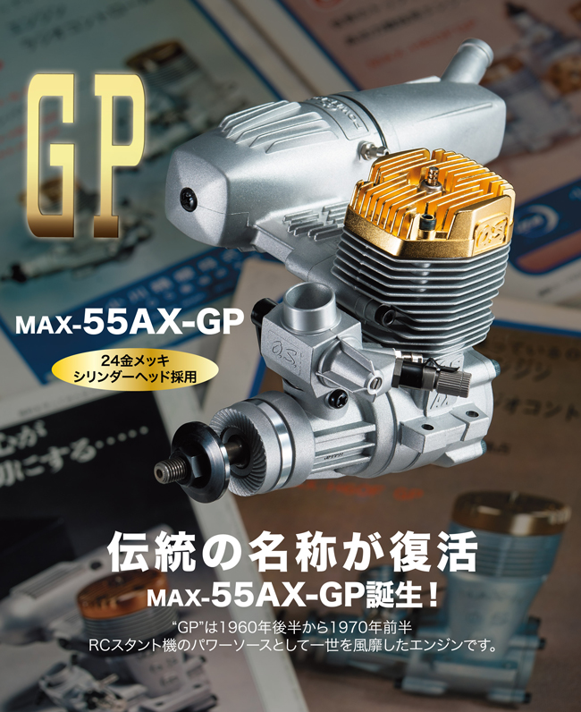 オールドスタントファンを中心に、今静かなブームになっている60スタント機。そのパワーソースとして“GP”の名称を冠したモデルが55AXで限定生産されます。ゴールドヘッドを纏ったそのスタイルはスペシャルそのもの、ヘッドの表面処理もOSこだわりの24金メッキを採用。ノスタルジックな機体はもちろん現代的なスタイルの機体にもマッチします。