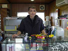 レース当日となる日曜日は、夜明け前まで降っていた雨でコースが湿っていましたが、ほぼスケジュール通りに練習走行を開始。(参加人数は計46人)そして予選ヒートとレースが進行していきます。お馴染みとなったMCである、ボンバーやまもとの絶叫アナウンスに後押しされ、各選手のラップタイムもラウンドを追うごとにヒートアップ。予選時から、激しいバトルの連続です。そして迎えた決勝ラウンド、最初に行われたリコイルクラスではなんと小学3年生で9歳の杉木選手が大人を抑えて、レース初優勝!! メカニック兼監督でもあるお父さんのアドバイスを忠実に守り、トップフィニッシュを決めたのでした。 |