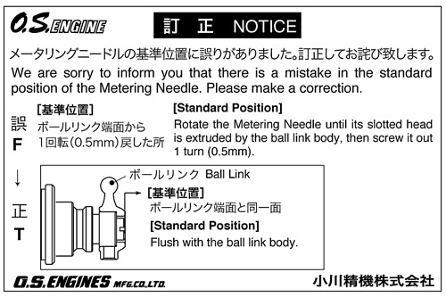 O.S.SPEEDR2101取扱説明書,メータリングニードルの基準位置に誤りがありました。訂正してお詫び申し上げます。訂正箇所は上記訂正表参照ください
