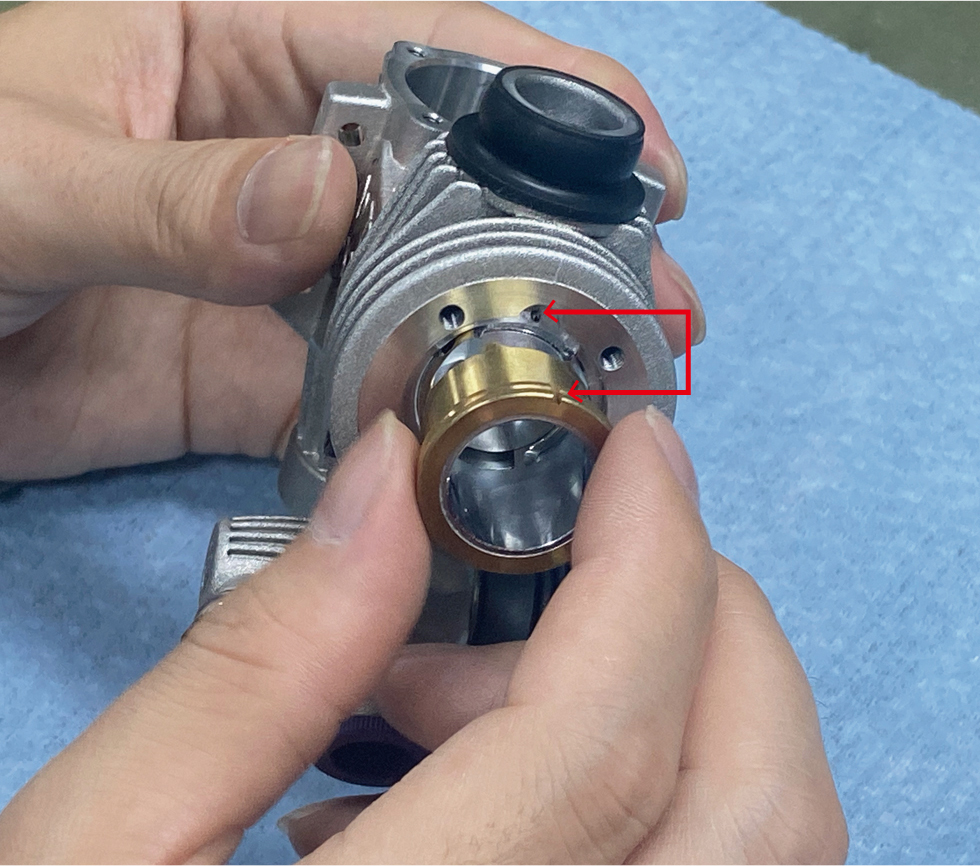 ⑫シリンダーライナーをクランクケースの上部から入れます。その際に、位置決めピンの位置を確認してシリンダーを入れましょう。