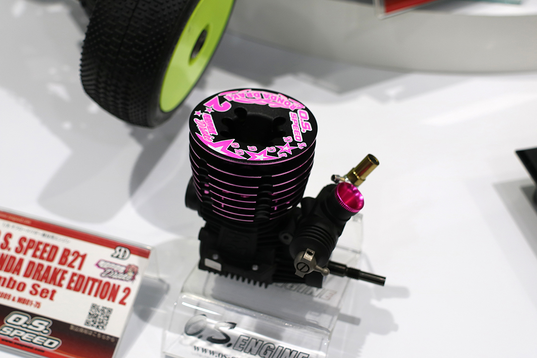 こちらのO.S.SPEEDが誇る人気シリーズの続編で、世界トップレベルのプロレーサーADAM DRAKE氏とともにメジャーなバギーレースに参戦しているADAM DRAKE氏の夫人、RONDA DRAKEさんがプロデュースしたエンジンの第2弾となります。この「O.S.SPEED B21 RONDA DRAKE 2」は、新デザインとなる軽量化と低重心化を施したアウターヘッドにより走行性能がアップ。デザインもベースとなるブラックに、RONDA DRAKEさんのイメージカラーであるピンクをアクセントに入れた2色アルマイトが鮮やかな仕上がりとなっており、ヘッドのグラフィック部も蛍光ピンクとホワイトの2色プリントを施しています。